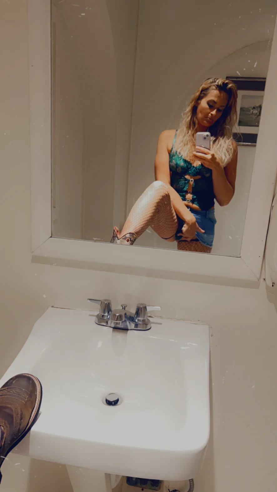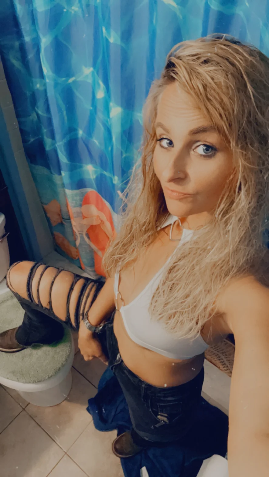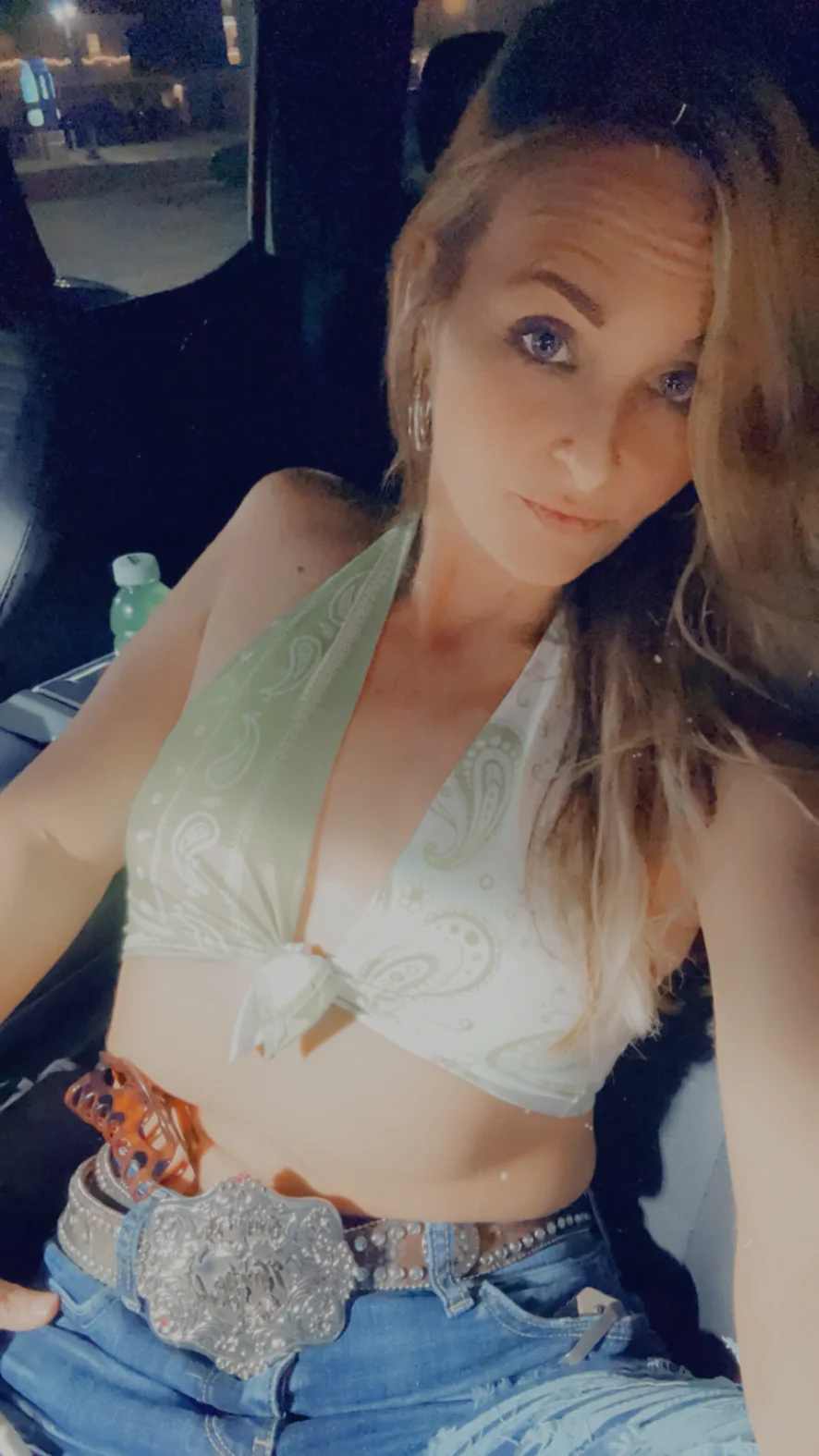 I wear a pair of ripped jeans with pink/vs thongs, Ariat boots with socks, and whatever mid drift shirt I decide looks cute. Send us pics of what you wear out!